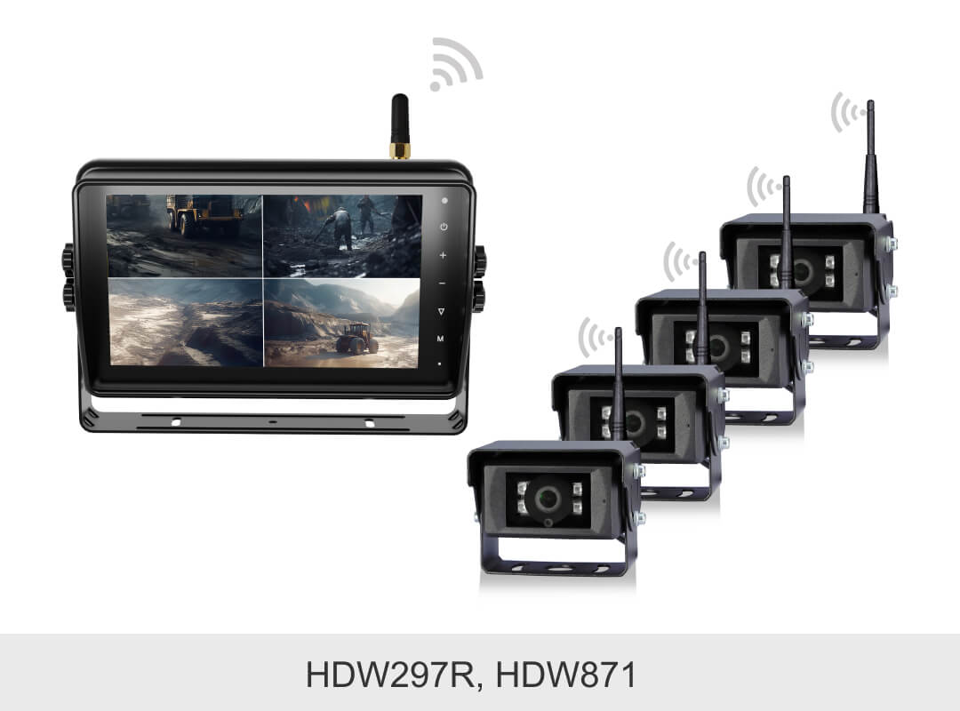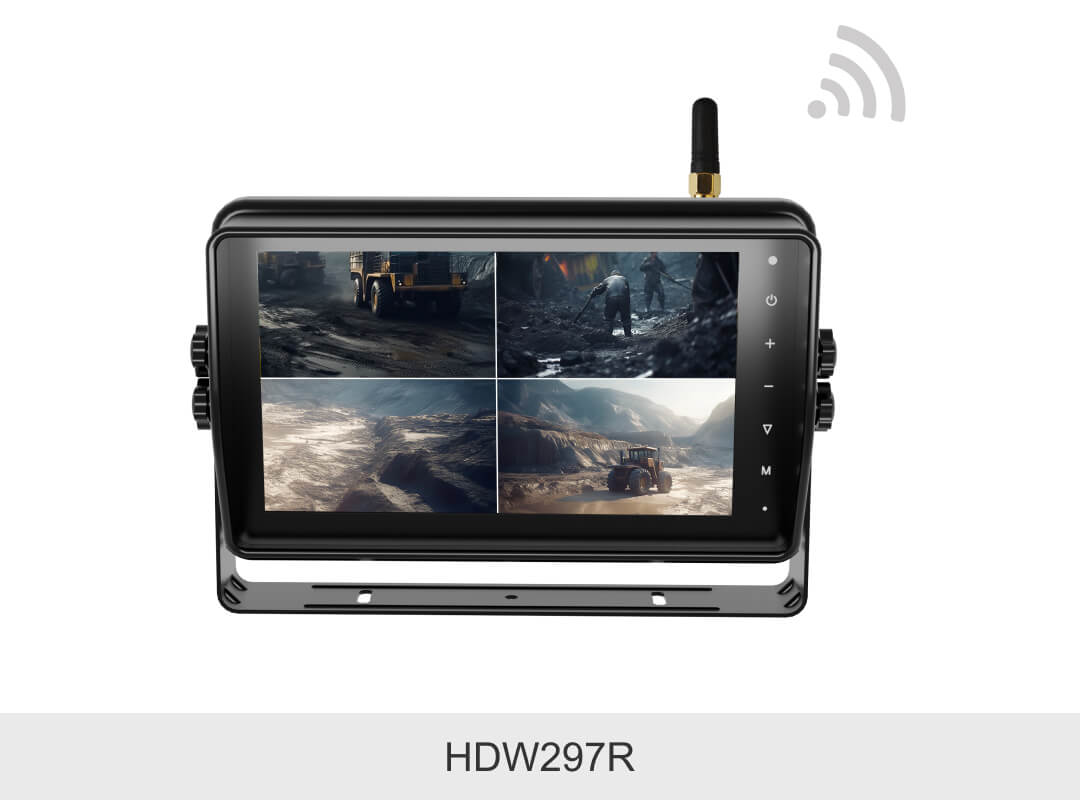 敏视10.1寸高清无线四分割车载录像监控显示器具有IP66防水外壳,配备录像和触屏功能;空旷传输距离最远达180m,信号稳定抗干扰,支持多画面显示模式,适用于卡车,叉车,矿车等各种车辆。