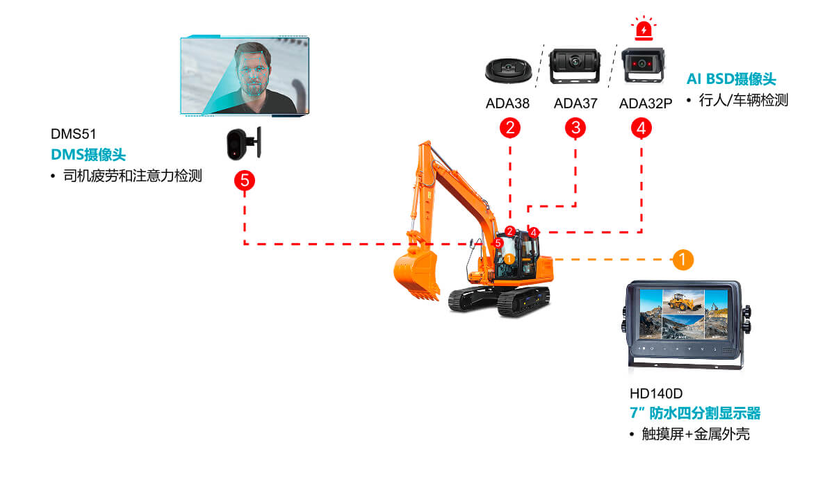更多360°全景环视系统实现AI全域检测,支持网络RTSP拉流,支持实时监控画面呈现在车载显示器或者车内中控屏(支持网络触屏协议/CAN 触屏协议),帮助司机安全高效作业。