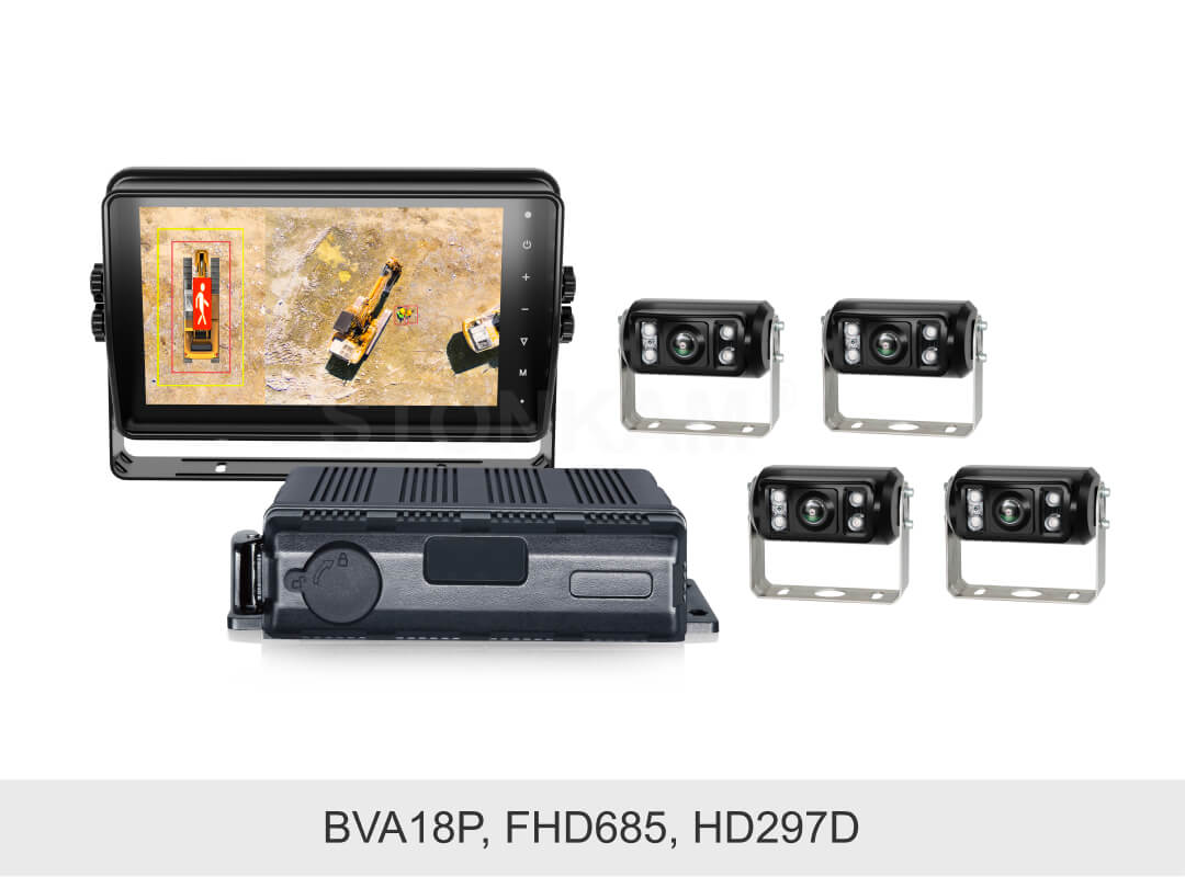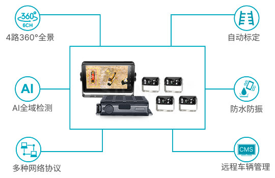 敏视工程车挖掘机360全景监控系统实现作业盲区AI全域检测,支持网络RTSP拉流,支持网络触屏协议/CAN 触屏协议,360全景监控画面实时呈现在车内中控屏或车载显示器,便于通过中控程序触控操作,帮助司机安全高效作业。